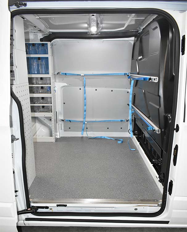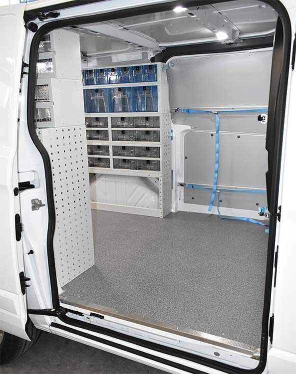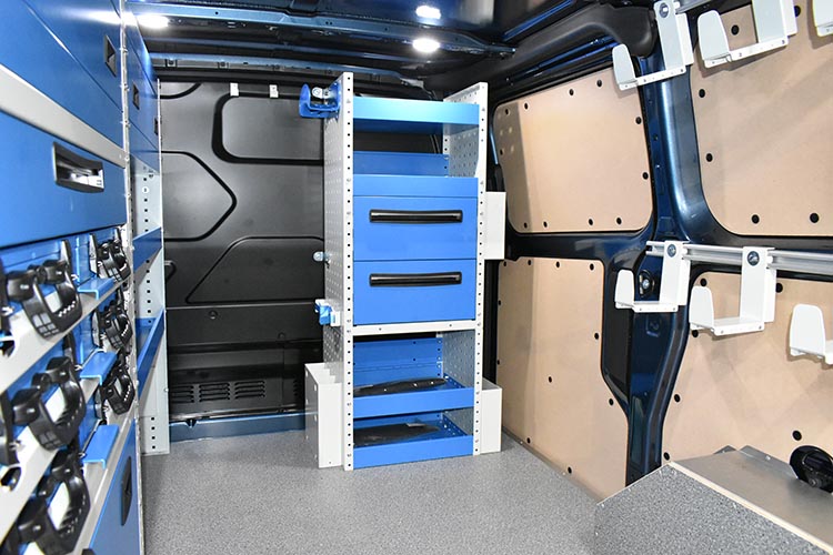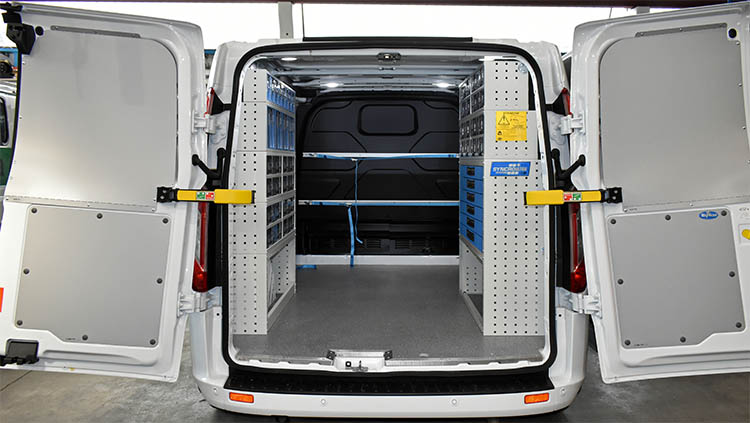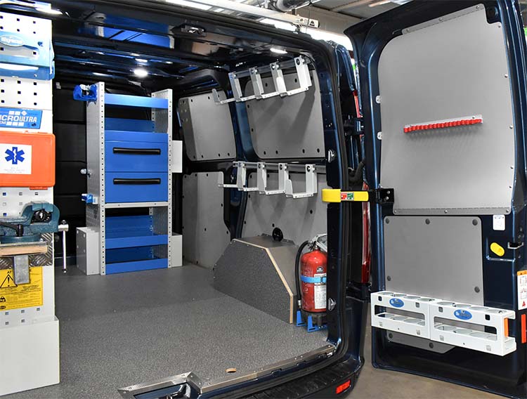 En el ejemplo de la galería fotográfica, el equipamiento se desarrolla en los tres lados del Custom, sin olvidarse de las puertas. De modo especial, en el lado izquierdo se concentran los muebles. Hay repisas abiertas o con puerta, un sujeta maletines con correas, bandejas porta maletines y un cajón metálico. El costado externo del mueble ha sido aprovechado para colocar una serie de accesorios: un porta rollo de papel, el botiquín con el kit de emergencia y un bolsillo metálico para objetos. En el vehículo se aprecia una abrazadera que se apoya en una porta abrazadera extraíble. La pared derecha se ha equipado con un versátil sistema de bloqueo de mercancías, formado por dos guías dispuestas en paralelo y una serie de ocho ganchos desplazables y regulables. Ambas puertas posteriores se han equipado con dos porta herramientas y dos porta bombonas. En la zona de carga se ha colgado un mueble formado por una serie de repisas y cajones, cuyos costados alojan otros accesorios: porta destornilladores, portacables.