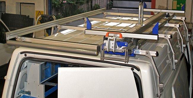 Los sistemas para el transporte en el techo fabricados por Syncro System permiten también equipar la parte superior del Transit 2014 como superficie de carga. En el catálogo están incluidos portapaquetes, bacas y portaescaleras específicos para este modelo Ford. Se trata de elementos sólidos y muy fiables, estudiados en los mínimos detalles para facilitar al máximo a los operadores. Los porta todo, por ejemplo, pueden llevar un rodillo que facilita la carga y descarga del material. Todas las barras están realizadas con el perfil aerodinámico Ultrasilent, que termina con los ruidos y vibraciones durante la marcha.