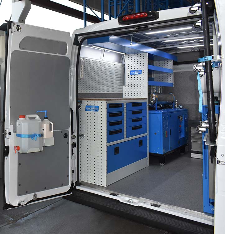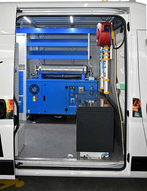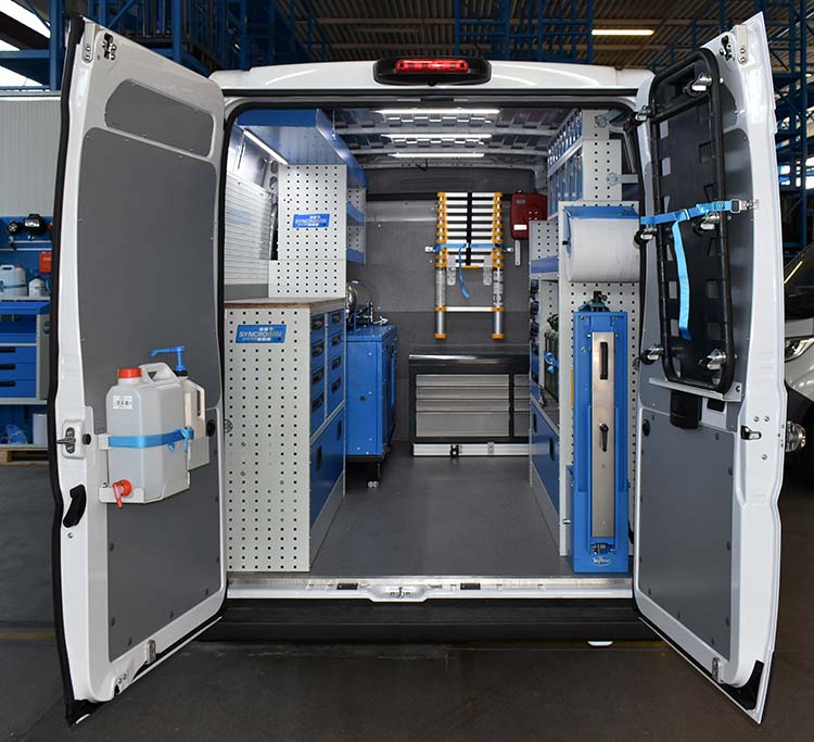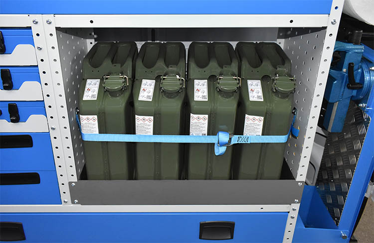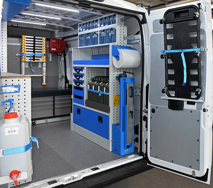 Para tranformar el Ducato – Ram promaster en un taller móvil el receptáculo se ha equipado por las tres paredes. A la izquierda se ha amueblado un rincón de trabajo con banco de madera marmoleado con luz de led, cajones metálicos, varias repisas abiertas y una máquina combinada generador compresor que garantiza la autonomía del operador en cualquier situación logística. En la parte derecha del receptáculo de carga se concentra la zona almacén: cabe destacar la repisa estanca para la conservación de tanques con líquidos, el porta abrazadera basculante y los cajones en plástico transparente. Entre los accesorios que enriquecen este equipamiento: