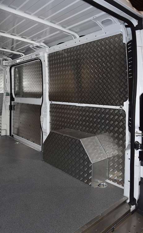 Plataformas para el suelo en aluminio damero o madera marmoleada (como en la foto) o en goma, paneles para las paredes, protector de separador de carga,protector de rueda, revestimiento para puerta, rejillas para las ventanas: son elementos que Syncro México propone en versión a medida para Ducato- Promaster.