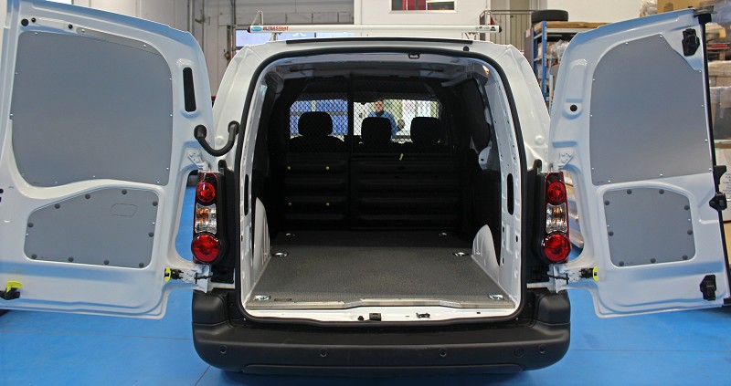 Es posible equipar Peugeot Partner aprovechando todo el espacio vertical a disposición con muebles, que pueden ocupar una sola o ambas paredes laterales. Protector abierto o cerrado o grandes repisas con estanterías, portamaletines o cajones, contenedores en plástico transparente basculantes de varios tamaños ofrecen grandes posibilidades de almacenaje de herramientas y recambios, minutería y otras mercancías en el interior de la furgoneta.