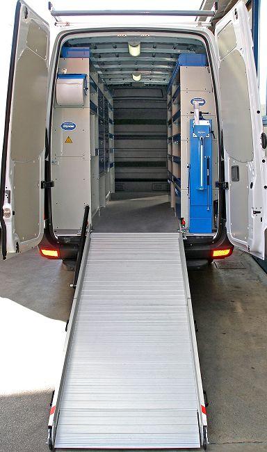 No faltan, entre los accesorios para el Crafter, los prácticos portaescaleras de una o dos correderas y los portapaquetes para transportar mercancías y materiales también en el techo del furgón VW. Dichos sistemas que se aplican en la parte más alta del vehículo son muy seguros y fiables y, gracias al uso de especiales perfiles de aluminio aerodinámicos garantizan también el máximo silencio durante la marcha. Una gran furgoneta presupone la necesidad de transportar mercancías y equipos pesados. Para cargar máquinas pesadas o motos dentro del Crafter, Syncro pone a disposición también varias rampas de carga con un alcance de 200 a 1.800 Kg. Los modelos con una capacidad de carga menor son fabricados totalmente en aluminio, son ligeros y económicos, mientras los más grandes están realizados en aluminio y acero.